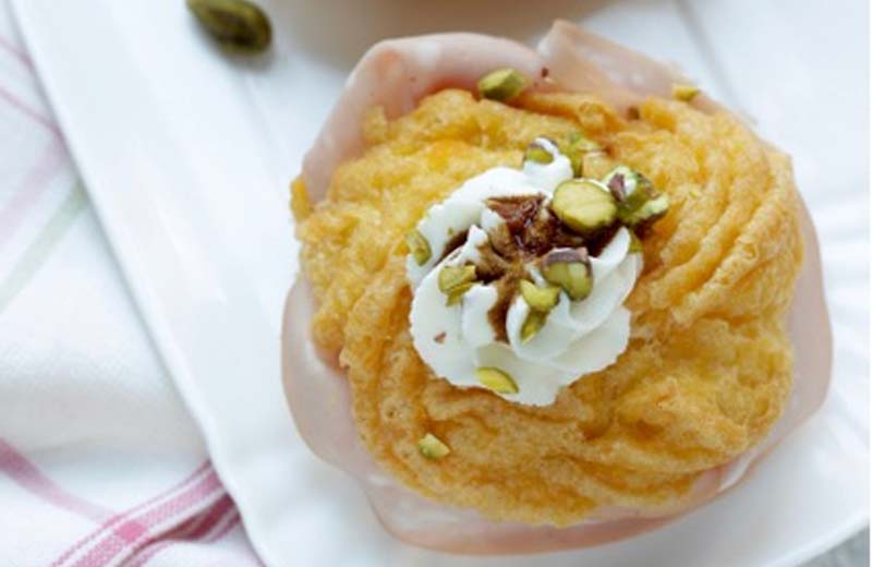 Tagliate a metà la zeppola, farcite con una fetta di Mortadella Bologna IGP, decorate al centro con un ciuffetto di ricotta un po’ di aceto balsamico e i pistacchi.
