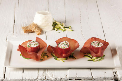 A piacere, è possibile guarnire i cilindretti ripieni, con altre fette di bresaola, in modo da creare dei petali di fiori o altre forme